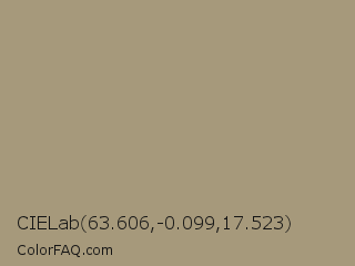 CIELab 63.606,-0.099,17.523 Color is a normal orange color and the nearest color is Donkey Brown #a69279. Hex code #a6997b and RGB value is rgb(166,153,123). In RGB color space, this color is composed of 65% red, 60% green, 48% blue, In CMYK color space, this color is composed of 0% cyan, 8% magenta, 26% yellow , 35% black , In HSL color space, this color has a hue angle of 42° , 19% saturation and 57% lightness.