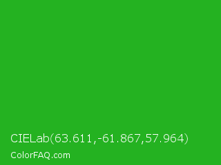 CIELab 63.611,-61.867,57.964 Color is a normal green color and the nearest color is Wageningen Green #34b233. Hex code #24b221 and RGB value is rgb(36,178,33). In RGB color space, this color is composed of 14% red, 70% green, 13% blue, In CMYK color space, this color is composed of 80% cyan, 0% magenta, 81% yellow , 30% black , In HSL color space, this color has a hue angle of 119° , 69% saturation and 41% lightness.
