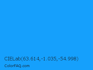 CIELab 63.614,-1.035,-54.998 Color is a normal blue color and the nearest color is Dodger Blue #1e90ff. Hex code #15a0fc and RGB value is rgb(21,160,252). In RGB color space, this color is composed of 8% red, 63% green, 99% blue, In CMYK color space, this color is composed of 92% cyan, 37% magenta, 0% yellow , 1% black , In HSL color space, this color has a hue angle of 204° , 97% saturation and 54% lightness.