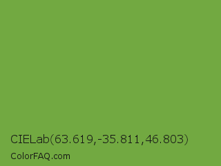 CIELab 63.619,-35.811,46.803 Color is a normal green color and the nearest color is Palm Leaf #6f9940. Hex code #72a941 and RGB value is rgb(114,169,65). In RGB color space, this color is composed of 45% red, 66% green, 25% blue, In CMYK color space, this color is composed of 33% cyan, 0% magenta, 62% yellow , 34% black , In HSL color space, this color has a hue angle of 92° , 44% saturation and 46% lightness.