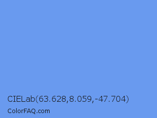 CIELab 63.628,8.059,-47.704 Color is a light blue color and the nearest color is Cornflower Blue #6495ed. Hex code #699aef and RGB value is rgb(105,154,239). In RGB color space, this color is composed of 41% red, 60% green, 94% blue, In CMYK color space, this color is composed of 56% cyan, 36% magenta, 0% yellow , 6% black , In HSL color space, this color has a hue angle of 218° , 81% saturation and 67% lightness.