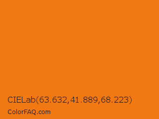 CIELab 63.632,41.889,68.223 Color is a normal orange color and the nearest color is Ecstasy #fa7814. Hex code #f27811 and RGB value is rgb(242,120,17). In RGB color space, this color is composed of 95% red, 47% green, 7% blue, In CMYK color space, this color is composed of 0% cyan, 50% magenta, 93% yellow , 5% black , In HSL color space, this color has a hue angle of 27° , 90% saturation and 51% lightness.