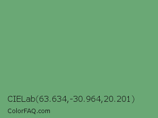 CIELab 63.634,-30.964,20.201 Color is a normal green color and the nearest color is Aqua Forest #5fa777. Hex code #6aa875 and RGB value is rgb(106,168,117). In RGB color space, this color is composed of 42% red, 66% green, 46% blue, In CMYK color space, this color is composed of 37% cyan, 0% magenta, 30% yellow , 34% black , In HSL color space, this color has a hue angle of 131° , 26% saturation and 54% lightness.