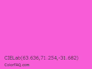 CIELab 63.636,71.254,-31.682 Color is a light magenta color and the nearest color is Light Deep Pink #ff5ccd. Hex code #f75dd4 and RGB value is rgb(247,93,212). In RGB color space, this color is composed of 97% red, 36% green, 83% blue, In CMYK color space, this color is composed of 0% cyan, 62% magenta, 14% yellow , 3% black , In HSL color space, this color has a hue angle of 314° , 91% saturation and 67% lightness.