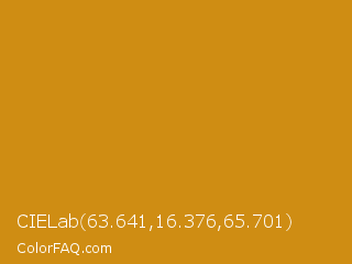 CIELab 63.641,16.376,65.701 Color is a normal orange color and the nearest color is Geebung #d18f1b. Hex code #cf8d13 and RGB value is rgb(207,141,19). In RGB color space, this color is composed of 81% red, 55% green, 7% blue, In CMYK color space, this color is composed of 0% cyan, 32% magenta, 91% yellow , 19% black , In HSL color space, this color has a hue angle of 39° , 83% saturation and 44% lightness.