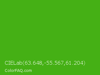 CIELab 63.648,-55.567,61.204 Color is a normal green color and the nearest color is Kelly Green #4cbb17. Hex code #45b015 and RGB value is rgb(69,176,21). In RGB color space, this color is composed of 27% red, 69% green, 8% blue, In CMYK color space, this color is composed of 61% cyan, 0% magenta, 88% yellow , 31% black , In HSL color space, this color has a hue angle of 101° , 79% saturation and 39% lightness.