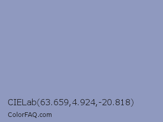CIELab 63.659,4.924,-20.818 Color is a light blue color and the nearest color is Blue Bell Crayola #9999cc. Hex code #8f99bf and RGB value is rgb(143,153,191). In RGB color space, this color is composed of 56% red, 60% green, 75% blue, In CMYK color space, this color is composed of 25% cyan, 20% magenta, 0% yellow , 25% black , In HSL color space, this color has a hue angle of 228° , 27% saturation and 65% lightness.