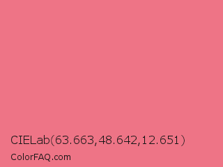CIELab 63.663,48.642,12.651 Color is a light red color and the nearest color is Froly #f57584. Hex code #ee7486 and RGB value is rgb(238,116,134). In RGB color space, this color is composed of 93% red, 45% green, 53% blue, In CMYK color space, this color is composed of 0% cyan, 51% magenta, 44% yellow , 7% black , In HSL color space, this color has a hue angle of 351° , 78% saturation and 69% lightness.
