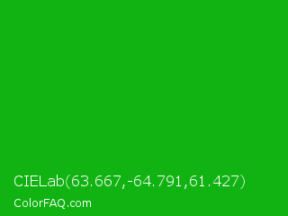 CIELab 63.667,-64.791,61.427 Color is a normal green color and the nearest color is Slimy Green #299617. Hex code #10b312 and RGB value is rgb(16,179,18). In RGB color space, this color is composed of 6% red, 70% green, 7% blue, In CMYK color space, this color is composed of 91% cyan, 0% magenta, 90% yellow , 30% black , In HSL color space, this color has a hue angle of 121° , 84% saturation and 38% lightness.