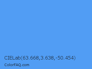 CIELab 63.668,3.638,-50.454 Color is a light blue color and the nearest color is United Nations Blue #5b92e5. Hex code #519df4 and RGB value is rgb(81,157,244). In RGB color space, this color is composed of 32% red, 62% green, 96% blue, In CMYK color space, this color is composed of 67% cyan, 36% magenta, 0% yellow , 4% black , In HSL color space, this color has a hue angle of 212° , 88% saturation and 64% lightness.