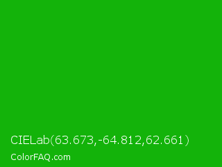 CIELab 63.673,-64.812,62.661 Color is a normal green color and the nearest color is Slimy Green #299617. Hex code #13b30a and RGB value is rgb(19,179,10). In RGB color space, this color is composed of 7% red, 70% green, 4% blue, In CMYK color space, this color is composed of 89% cyan, 0% magenta, 94% yellow , 30% black , In HSL color space, this color has a hue angle of 117° , 89% saturation and 37% lightness.