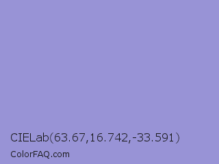 CIELab 63.67,16.742,-33.591 Color is a light indigo color and the nearest color is Blue Bell Crayola #9999cc. Hex code #9893d6 and RGB value is rgb(152,147,214). In RGB color space, this color is composed of 60% red, 58% green, 84% blue, In CMYK color space, this color is composed of 29% cyan, 31% magenta, 0% yellow , 16% black , In HSL color space, this color has a hue angle of 244° , 45% saturation and 71% lightness.