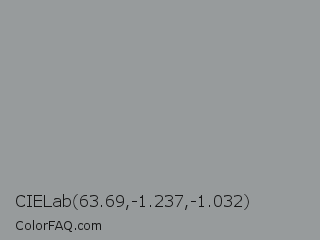 CIELab 63.69,-1.237,-1.032 Color is a normal cyan color and the nearest color is Spanish Gray #989898. Hex code #979b9c and RGB value is rgb(151,155,156). In RGB color space, this color is composed of 59% red, 61% green, 61% blue, In CMYK color space, this color is composed of 3% cyan, 1% magenta, 0% yellow , 39% black , In HSL color space, this color has a hue angle of 192° , 2% saturation and 60% lightness.