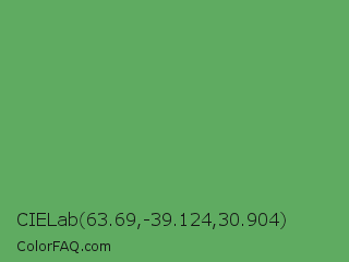 CIELab 63.69,-39.124,30.904 Color is a normal green color and the nearest color is Fern #63b76c. Hex code #5fab61 and RGB value is rgb(95,171,97). In RGB color space, this color is composed of 37% red, 67% green, 38% blue, In CMYK color space, this color is composed of 44% cyan, 0% magenta, 43% yellow , 33% black , In HSL color space, this color has a hue angle of 122° , 31% saturation and 52% lightness.