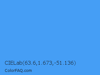 CIELab 63.6,1.673,-51.136 Color is a light blue color and the nearest color is Brilliant Azure #3399ff. Hex code #459ef5 and RGB value is rgb(69,158,245). In RGB color space, this color is composed of 27% red, 62% green, 96% blue, In CMYK color space, this color is composed of 72% cyan, 36% magenta, 0% yellow , 4% black , In HSL color space, this color has a hue angle of 210° , 90% saturation and 62% lightness.
