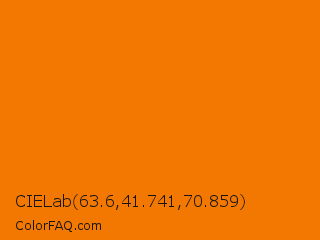 CIELab 63.6,41.741,70.859 Color is a normal orange color and the nearest color is Chilean Fire #f77703. Hex code #f27801 and RGB value is rgb(242,120,1). In RGB color space, this color is composed of 95% red, 47% green, 0% blue, In CMYK color space, this color is composed of 0% cyan, 50% magenta, 100% yellow , 5% black , In HSL color space, this color has a hue angle of 30° , 99% saturation and 48% lightness.