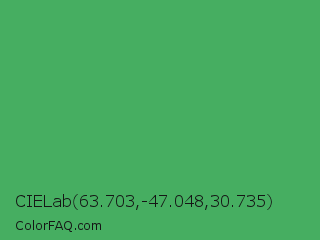 CIELab 63.703,-47.048,30.735 Color is a normal green color and the nearest color is Chateau Green #40a860. Hex code #46ae61 and RGB value is rgb(70,174,97). In RGB color space, this color is composed of 27% red, 68% green, 38% blue, In CMYK color space, this color is composed of 60% cyan, 0% magenta, 44% yellow , 32% black , In HSL color space, this color has a hue angle of 136° , 43% saturation and 48% lightness.