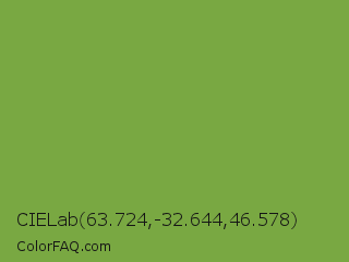 CIELab 63.724,-32.644,46.578 Color is a normal green color and the nearest color is Sushi #87ab39. Hex code #79a842 and RGB value is rgb(121,168,66). In RGB color space, this color is composed of 47% red, 66% green, 26% blue, In CMYK color space, this color is composed of 28% cyan, 0% magenta, 61% yellow , 34% black , In HSL color space, this color has a hue angle of 88° , 44% saturation and 46% lightness.