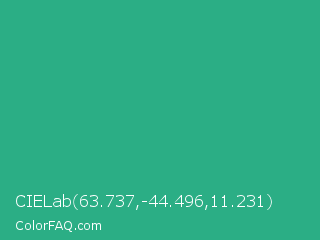 CIELab 63.737,-44.496,11.231 Color is a normal green color and the nearest color is Jungle Green #29ab87. Hex code #2bae85 and RGB value is rgb(43,174,133). In RGB color space, this color is composed of 17% red, 68% green, 52% blue, In CMYK color space, this color is composed of 75% cyan, 0% magenta, 24% yellow , 32% black , In HSL color space, this color has a hue angle of 161° , 60% saturation and 43% lightness.