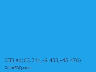 CIELab 63.741,-8.433,-45.476 Color is a normal blue color and the nearest color is Button Blue #24a0ed. Hex code #1fa3eb and RGB value is rgb(31,163,235). In RGB color space, this color is composed of 12% red, 64% green, 92% blue, In CMYK color space, this color is composed of 87% cyan, 31% magenta, 0% yellow , 8% black , In HSL color space, this color has a hue angle of 201° , 84% saturation and 52% lightness.