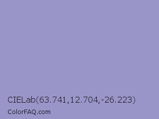 CIELab 63.741,12.704,-26.223 Color is a light indigo color and the nearest color is Blue Bell Crayola #9999cc. Hex code #9995c9 and RGB value is rgb(153,149,201). In RGB color space, this color is composed of 60% red, 58% green, 79% blue, In CMYK color space, this color is composed of 24% cyan, 26% magenta, 0% yellow , 21% black , In HSL color space, this color has a hue angle of 245° , 33% saturation and 69% lightness.