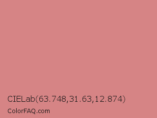 CIELab 63.748,31.63,12.874 Color is a light red color and the nearest color is New York Pink #d7837f. Hex code #d68485 and RGB value is rgb(214,132,133). In RGB color space, this color is composed of 84% red, 52% green, 52% blue, In CMYK color space, this color is composed of 0% cyan, 38% magenta, 38% yellow , 16% black , In HSL color space, this color has a hue angle of 359° , 50% saturation and 68% lightness.