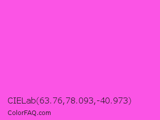 CIELab 63.76,78.093,-40.973 Color is a light magenta color and the nearest color is Purple Pizzazz #fe4eda. Hex code #fb54e5 and RGB value is rgb(251,84,229). In RGB color space, this color is composed of 98% red, 33% green, 90% blue, In CMYK color space, this color is composed of 0% cyan, 67% magenta, 9% yellow , 2% black , In HSL color space, this color has a hue angle of 308° , 95% saturation and 66% lightness.