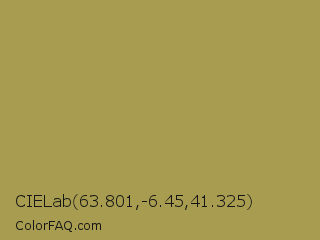 CIELab 63.801,-6.45,41.325 Color is a normal yellow color and the nearest color is Limed Oak #ac8a56. Hex code #a79c4f and RGB value is rgb(167,156,79). In RGB color space, this color is composed of 65% red, 61% green, 31% blue, In CMYK color space, this color is composed of 0% cyan, 7% magenta, 53% yellow , 35% black , In HSL color space, this color has a hue angle of 53° , 36% saturation and 48% lightness.