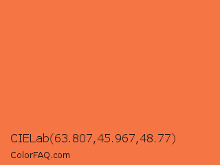 CIELab 63.807,45.967,48.77 Color is a light orange color and the nearest color is Mandarin #f37a48. Hex code #f57545 and RGB value is rgb(245,117,69). In RGB color space, this color is composed of 96% red, 46% green, 27% blue, In CMYK color space, this color is composed of 0% cyan, 52% magenta, 72% yellow , 4% black , In HSL color space, this color has a hue angle of 16° , 90% saturation and 62% lightness.