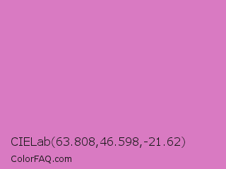 CIELab 63.808,46.598,-21.62 Color is a light magenta color and the nearest color is Middle Purple #d982b5. Hex code #d97ac2 and RGB value is rgb(217,122,194). In RGB color space, this color is composed of 85% red, 48% green, 76% blue, In CMYK color space, this color is composed of 0% cyan, 44% magenta, 11% yellow , 15% black , In HSL color space, this color has a hue angle of 315° , 56% saturation and 66% lightness.