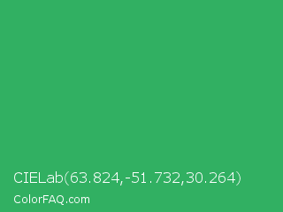 CIELab 63.824,-51.732,30.264 Color is a normal green color and the nearest color is Chateau Green #40a860. Hex code #31b062 and RGB value is rgb(49,176,98). In RGB color space, this color is composed of 19% red, 69% green, 38% blue, In CMYK color space, this color is composed of 72% cyan, 0% magenta, 44% yellow , 31% black , In HSL color space, this color has a hue angle of 143° , 56% saturation and 44% lightness.