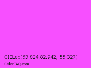 CIELab 63.824,82.942,-55.327 Color is a light magenta color and the nearest color is Pink Flamingo Crayola #ff66ff. Hex code #f74fff and RGB value is rgb(247,79,255). In RGB color space, this color is composed of 97% red, 31% green, 100% blue, In CMYK color space, this color is composed of 3% cyan, 69% magenta, 0% yellow , 0% black , In HSL color space, this color has a hue angle of 297° , 100% saturation and 65% lightness.