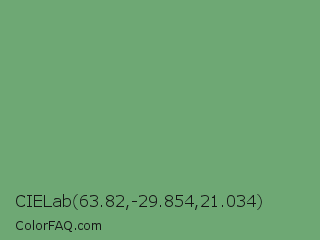 CIELab 63.82,-29.854,21.034 Color is a normal green color and the nearest color is Aqua Forest #5fa777. Hex code #6ea874 and RGB value is rgb(110,168,116). In RGB color space, this color is composed of 43% red, 66% green, 45% blue, In CMYK color space, this color is composed of 35% cyan, 0% magenta, 31% yellow , 34% black , In HSL color space, this color has a hue angle of 126° , 25% saturation and 55% lightness.
