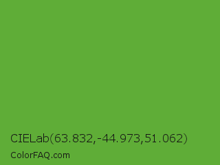 CIELab 63.832,-44.973,51.062 Color is a normal green color and the nearest color is Green RYB #66b032. Hex code #5fad37 and RGB value is rgb(95,173,55). In RGB color space, this color is composed of 37% red, 68% green, 22% blue, In CMYK color space, this color is composed of 45% cyan, 0% magenta, 68% yellow , 32% black , In HSL color space, this color has a hue angle of 100° , 52% saturation and 45% lightness.