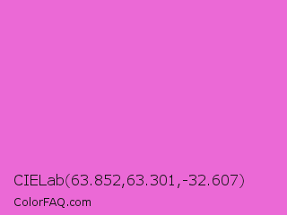 CIELab 63.852,63.301,-32.607 Color is a light magenta color and the nearest color is Orchid #da70d6. Hex code #eb69d6 and RGB value is rgb(235,105,214). In RGB color space, this color is composed of 92% red, 41% green, 84% blue, In CMYK color space, this color is composed of 0% cyan, 55% magenta, 9% yellow , 8% black , In HSL color space, this color has a hue angle of 310° , 76% saturation and 67% lightness.