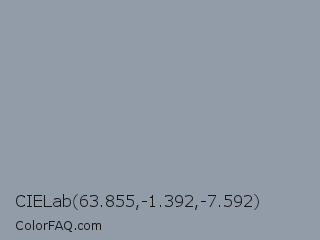 CIELab 63.855,-1.392,-7.592 Color is a light blue color and the nearest color is Manatee #979aaa. Hex code #919ca8 and RGB value is rgb(145,156,168). In RGB color space, this color is composed of 57% red, 61% green, 66% blue, In CMYK color space, this color is composed of 14% cyan, 7% magenta, 0% yellow , 34% black , In HSL color space, this color has a hue angle of 211° , 12% saturation and 61% lightness.