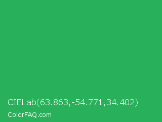 CIELab 63.863,-54.771,34.402 Color is a normal green color and the nearest color is Chateau Green #40a860. Hex code #28b15a and RGB value is rgb(40,177,90). In RGB color space, this color is composed of 16% red, 69% green, 35% blue, In CMYK color space, this color is composed of 77% cyan, 0% magenta, 49% yellow , 31% black , In HSL color space, this color has a hue angle of 142° , 63% saturation and 43% lightness.