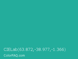 CIELab 63.872,-38.977,-1.366 Color is a normal cyan color and the nearest color is Light Sea Green #20b2aa. Hex code #23ad9c and RGB value is rgb(35,173,156). In RGB color space, this color is composed of 14% red, 68% green, 61% blue, In CMYK color space, this color is composed of 80% cyan, 0% magenta, 10% yellow , 32% black , In HSL color space, this color has a hue angle of 173° , 66% saturation and 41% lightness.