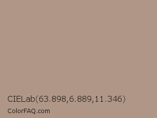 CIELab 63.898,6.889,11.346 Color is a light orange color and the nearest color is Grullo #a99a86. Hex code #af9687 and RGB value is rgb(175,150,135). In RGB color space, this color is composed of 69% red, 59% green, 53% blue, In CMYK color space, this color is composed of 0% cyan, 14% magenta, 23% yellow , 31% black , In HSL color space, this color has a hue angle of 23° , 20% saturation and 61% lightness.
