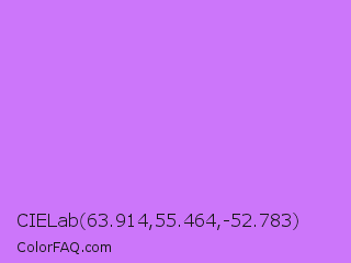 CIELab 63.914,55.464,-52.783 Color is a light purple color and the nearest color is Heliotrope #df73ff. Hex code #cc76fa and RGB value is rgb(204,118,250). In RGB color space, this color is composed of 80% red, 46% green, 98% blue, In CMYK color space, this color is composed of 18% cyan, 53% magenta, 0% yellow , 2% black , In HSL color space, this color has a hue angle of 279° , 93% saturation and 72% lightness.