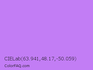 CIELab 63.941,48.17,-50.059 Color is a light purple color and the nearest color is Lavender #b57edc. Hex code #c27df5 and RGB value is rgb(194,125,245). In RGB color space, this color is composed of 76% red, 49% green, 96% blue, In CMYK color space, this color is composed of 21% cyan, 49% magenta, 0% yellow , 4% black , In HSL color space, this color has a hue angle of 275° , 86% saturation and 73% lightness.