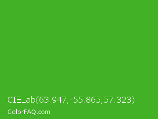 CIELab 63.947,-55.865,57.323 Color is a normal green color and the nearest color is Wageningen Green #34b233. Hex code #42b125 and RGB value is rgb(66,177,37). In RGB color space, this color is composed of 26% red, 69% green, 15% blue, In CMYK color space, this color is composed of 63% cyan, 0% magenta, 79% yellow , 31% black , In HSL color space, this color has a hue angle of 108° , 65% saturation and 42% lightness.