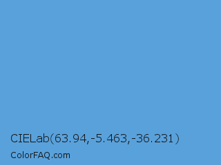 CIELab 63.94,-5.463,-36.231 Color is a normal blue color and the nearest color is Carolina Blue #56a0d3. Hex code #59a1db and RGB value is rgb(89,161,219). In RGB color space, this color is composed of 35% red, 63% green, 86% blue, In CMYK color space, this color is composed of 59% cyan, 26% magenta, 0% yellow , 14% black , In HSL color space, this color has a hue angle of 207° , 64% saturation and 60% lightness.