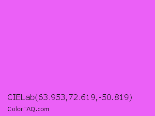 CIELab 63.953,72.619,-50.819 Color is a light magenta color and the nearest color is Pink Flamingo Crayola #ff66ff. Hex code #eb60f7 and RGB value is rgb(235,96,247). In RGB color space, this color is composed of 92% red, 38% green, 97% blue, In CMYK color space, this color is composed of 5% cyan, 61% magenta, 0% yellow , 3% black , In HSL color space, this color has a hue angle of 295° , 90% saturation and 67% lightness.