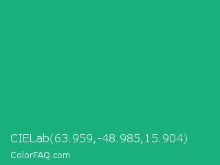 CIELab 63.959,-48.985,15.904 Color is a normal green color and the nearest color is Green Crayola #1cac78. Hex code #1ab07d and RGB value is rgb(26,176,125). In RGB color space, this color is composed of 10% red, 69% green, 49% blue, In CMYK color space, this color is composed of 85% cyan, 0% magenta, 29% yellow , 31% black , In HSL color space, this color has a hue angle of 160° , 74% saturation and 40% lightness.