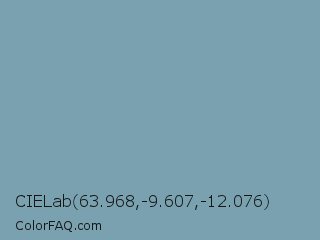 CIELab 63.968,-9.607,-12.076 Color is a normal blue color and the nearest color is Gumbo #7ca1a6. Hex code #7aa1b0 and RGB value is rgb(122,161,176). In RGB color space, this color is composed of 48% red, 63% green, 69% blue, In CMYK color space, this color is composed of 31% cyan, 9% magenta, 0% yellow , 31% black , In HSL color space, this color has a hue angle of 197° , 25% saturation and 58% lightness.