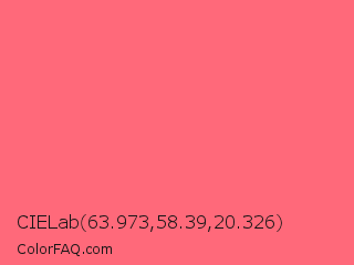 CIELab 63.973,58.39,20.326 Color is a light red color and the nearest color is Begonia #fa6e79. Hex code #ff697a and RGB value is rgb(255,105,122). In RGB color space, this color is composed of 100% red, 41% green, 48% blue, In CMYK color space, this color is composed of 0% cyan, 59% magenta, 52% yellow , 0% black , In HSL color space, this color has a hue angle of 353° , 100% saturation and 71% lightness.