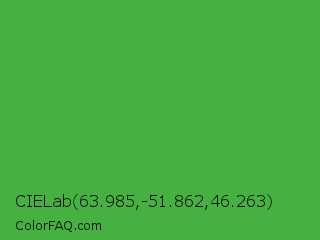CIELab 63.985,-51.862,46.263 Color is a normal green color and the nearest color is Apple #4fa83d. Hex code #47b042 and RGB value is rgb(71,176,66). In RGB color space, this color is composed of 28% red, 69% green, 26% blue, In CMYK color space, this color is composed of 60% cyan, 0% magenta, 63% yellow , 31% black , In HSL color space, this color has a hue angle of 117° , 45% saturation and 47% lightness.