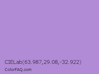 CIELab 63.987,29.08,-32.922 Color is a light purple color and the nearest color is East Side #ac91ce. Hex code #b28bd6 and RGB value is rgb(178,139,214). In RGB color space, this color is composed of 70% red, 55% green, 84% blue, In CMYK color space, this color is composed of 17% cyan, 35% magenta, 0% yellow , 16% black , In HSL color space, this color has a hue angle of 271° , 48% saturation and 69% lightness.