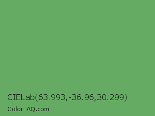 CIELab 63.993,-36.96,30.299 Color is a normal green color and the nearest color is Fern #63b76c. Hex code #65ab63 and RGB value is rgb(101,171,99). In RGB color space, this color is composed of 40% red, 67% green, 39% blue, In CMYK color space, this color is composed of 41% cyan, 0% magenta, 42% yellow , 33% black , In HSL color space, this color has a hue angle of 118° , 30% saturation and 53% lightness.